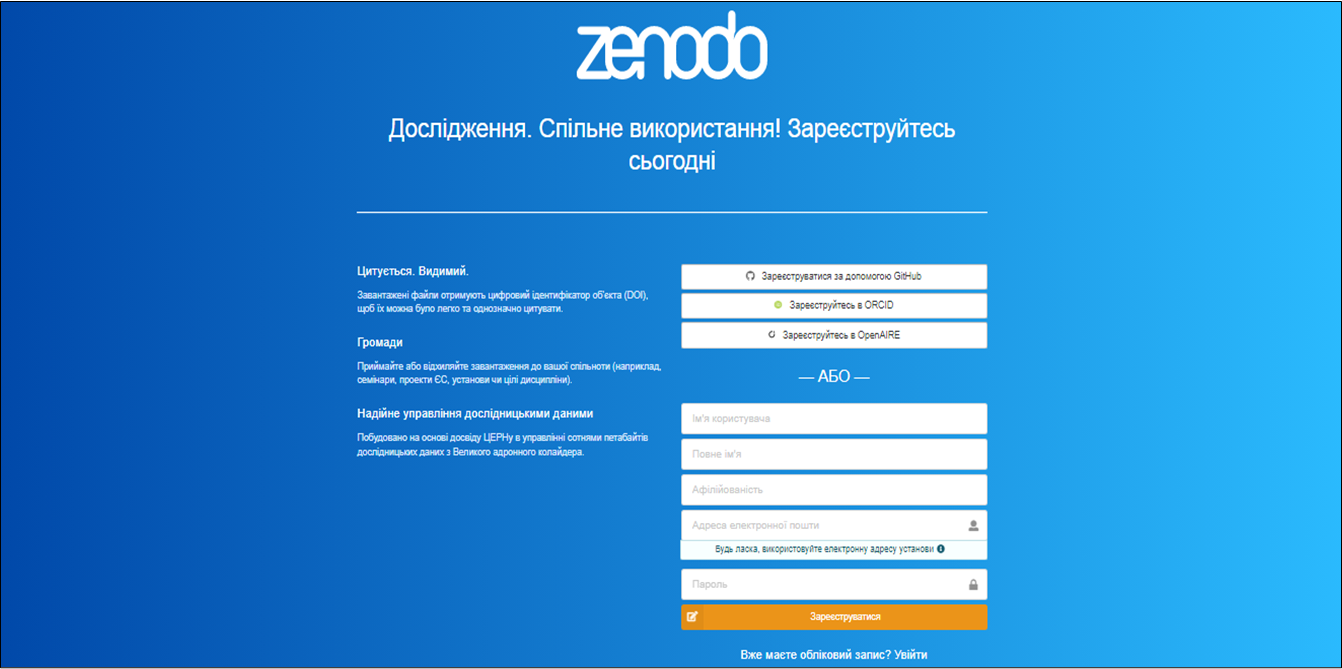 1. Зареєструйтеся або увійдіть у свій обліковий запис на сторінці https://zenodo.org