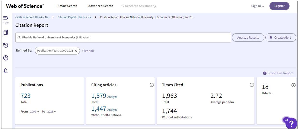 Пропонуємо ознайомитися зі звітом з цитування ХНЕУ ім. С.Кузнеця у Web of Science.на 1 квітня 2026 року, а також із статистичними даними профілю ХНЕУ ім. С.Кузнеця в наукометричній базі даних Scopus.